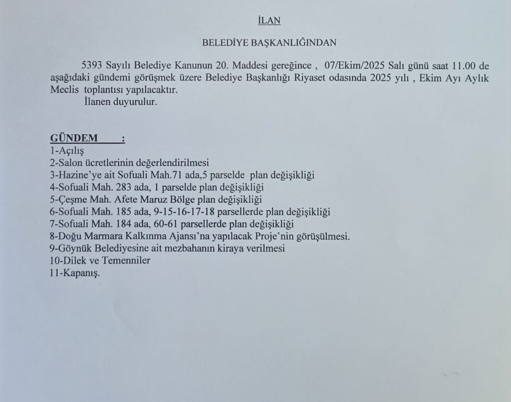 2025 YILI EKİM AYI MECLİS TOPLANTISI İLANI Göynük Belediyesi 1 hafta önce Duyurular, Göynük Belediyesi 2025 YILI EKİM AYI MECLİS TOPLANTISI İLANI için yorumlar kapalı 97 Görüntüleme Benzer Başlıklar KURBAN BAYRAMI MÜNASEBETİYLE ŞEHİT AİLELERİMİZE BAYRAM ZİYARETİ VE KAMU PERSONELİ-HALK BAYRAMLAŞMASI PROGRAMI GERÇEKLEŞTİRİLDİ. 8 Haziran 2025 TARİHİ GAZİ SÜLEYMAN PAŞA HAMAMI AÇILIŞI GERÇEKLEŞTİRİLDİ. 3 Haziran 2025 35. AKŞEMSEDDİN HZ. ANMA GÜNÜ ETKİNLİKLERİ GERÇEKLEŞTİRİLDİ 27 Mayıs 2025 2025-10-03 Göynük Belediyesi Paylaş Facebook Twitter
