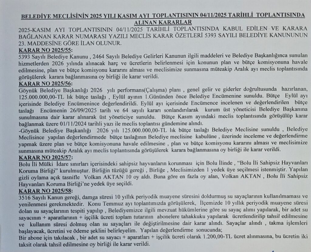 2025 YILI KASIM AYI MECLİS TOPLANTISI ALINAN KARARLAR Göynük Belediyesi 4 saat önce Duyurular, Göynük Belediyesi 2025 YILI KASIM AYI MECLİS TOPLANTISI ALINAN KARARLAR için yorumlar kapalı 16 Görüntüleme Benzer Başlıklar SU SAYACI DEĞİŞİMİ 5 gün önce KURBAN BAYRAMI MÜNASEBETİYLE ŞEHİT AİLELERİMİZE BAYRAM ZİYARETİ VE KAMU PERSONELİ-HALK BAYRAMLAŞMASI PROGRAMI GERÇEKLEŞTİRİLDİ. 8 Haziran 2025 TARİHİ GAZİ SÜLEYMAN PAŞA HAMAMI AÇILIŞI GERÇEKLEŞTİRİLDİ. 3 Haziran 2025 2025-11-04 Göynük Belediyesi Paylaş Facebook Twitter