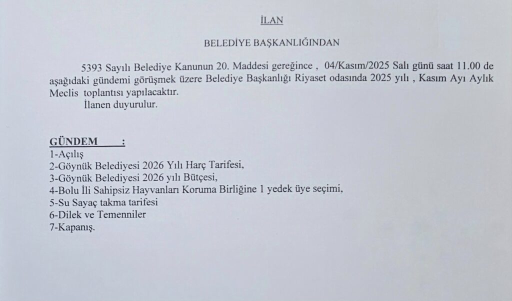 2025 YILI KASIM AYI MECLİS TOPLANTISI İLANI Göynük Belediyesi 8 saat önce Duyurular, Göynük Belediyesi 2025 YILI KASIM AYI MECLİS TOPLANTISI İLANI için yorumlar kapalı 20 Görüntüleme Benzer Başlıklar SU SAYACI DEĞİŞİMİ 1 gün önce KURBAN BAYRAMI MÜNASEBETİYLE ŞEHİT AİLELERİMİZE BAYRAM ZİYARETİ VE KAMU PERSONELİ-HALK BAYRAMLAŞMASI PROGRAMI GERÇEKLEŞTİRİLDİ. 8 Haziran 2025 TARİHİ GAZİ SÜLEYMAN PAŞA HAMAMI AÇILIŞI GERÇEKLEŞTİRİLDİ. 3 Haziran 2025 2025-10-31 Göynük Belediyesi Paylaş Facebook Twitter
