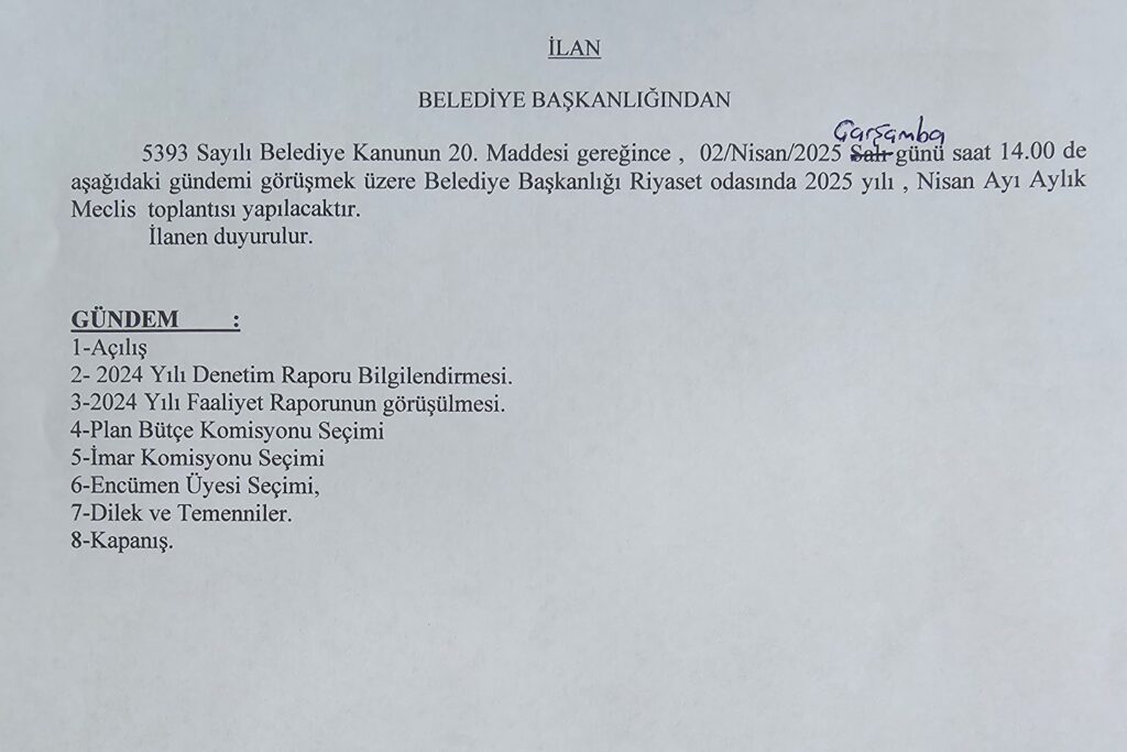 2025 YILI NİSAN AYI MECLİS TOPLANTISI İLANI Göynük Belediyesi 27 Mart 2025 Genel 2025 YILI NİSAN AYI MECLİS TOPLANTISI İLANI için yorumlar kapalı 460 Görüntüleme Benzer Başlıklar 2025 YILI ARALIK AYI MECLİS TOPLANTISI İLANI 2 hafta önce 2025 YILI KASIM AYI MECLİS TOPLANTISI ALINAN KARARLAR 4 Kasım 2025 2025 YILI KASIM AYI MECLİS TOPLANTISI İLANI 31 Ekim 2025 2025-03-27 Göynük Belediyesi Paylaş Facebook Twitter