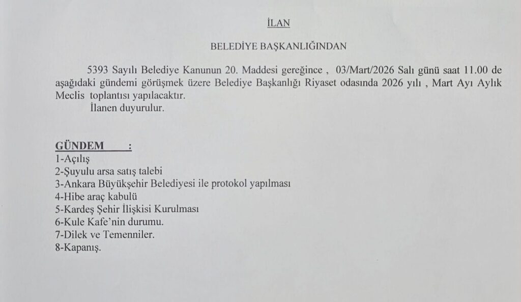 2026 YILI MART AYI MECLİS TOPLANTISI İLANI Göynük Belediyesi 2 saat önce Duyurular, Göynük Belediyesi 2026 YILI MART AYI MECLİS TOPLANTISI İLANI için yorumlar kapalı 8 Görüntüleme Benzer Başlıklar BELEDİYE BAŞKANI ALİ ORAL’IN YENİ YIL MESAJI 31 Aralık 2025 İLÇEMİZ GENELİNDE KİLİT PARKE, DOĞAL TAŞ, BORDÜR VE BEGONİT TAŞ ÇALIŞMALARI GERÇEKLEŞTİRİLDİ. 22 Aralık 2025 ASFALT ÇALIŞMASI TAMAMLANDI. 19 Aralık 2025 2026-02-27 Göynük Belediyesi Paylaş Facebook Twitter