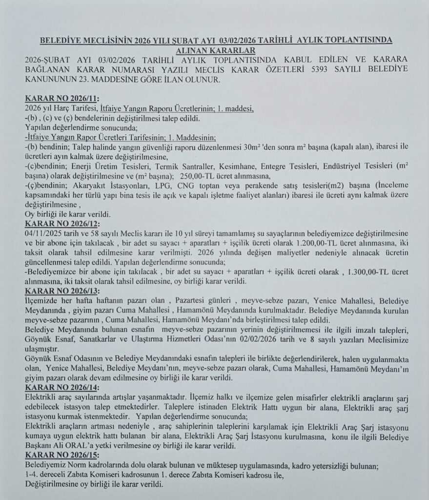 2026 YILI ŞUBAT AYI MECLİS TOPLANTISI ALINAN KARARLAR Göynük Belediyesi 2 saat önce Duyurular, Göynük Belediyesi 2026 YILI ŞUBAT AYI MECLİS TOPLANTISI ALINAN KARARLAR için yorumlar kapalı 7 Görüntüleme Benzer Başlıklar BELEDİYE BAŞKANI ALİ ORAL’IN YENİ YIL MESAJI 31 Aralık 2025 İLÇEMİZ GENELİNDE KİLİT PARKE, DOĞAL TAŞ, BORDÜR VE BEGONİT TAŞ ÇALIŞMALARI GERÇEKLEŞTİRİLDİ. 22 Aralık 2025 ASFALT ÇALIŞMASI TAMAMLANDI. 19 Aralık 2025 2026-02-05 Göynük Belediyesi Paylaş Facebook Twitter