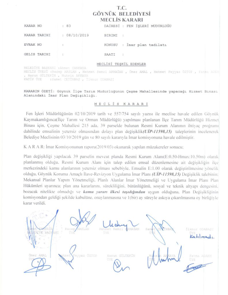 Fen İşleri Müdürlüğünün 02/10/2019 tarih ve 557/754 sayılı yazısı ile meclise havale edilen Göynük Kaymakamlığınca(İlçe Tarım ve Orman Müdürlüğü) yapılması planlanan İlçe Tarım Müdürlüğü Hizmet Binası için, Çeşme Mahallesi 215 ada, 39 parselde bulunan Resmi Kurum Alanının ihtiyaç proğramı dahilinde emsalinin yetersiz olmasından dolayı plan değişiklik(UİP-11598,15) taleplerinin incelenerek Belediye Meclisinin 03/10/2019 gün ve 80 sayılı kararıyla İmar komisyonuna havale edilmiştir. 3194 sayılı İmar kanununun 8-b maddesine ve Mekansal planlar yapım yönetmeliğine istinaden konunun meclisimizde görüşülmesi sonucunda; Belediyemiz Meclisinin 08/10/2019 gün ve 83 sayılı kararı ile uygulama imar planı değişikliği oybirliğiyle onaylamıştır.