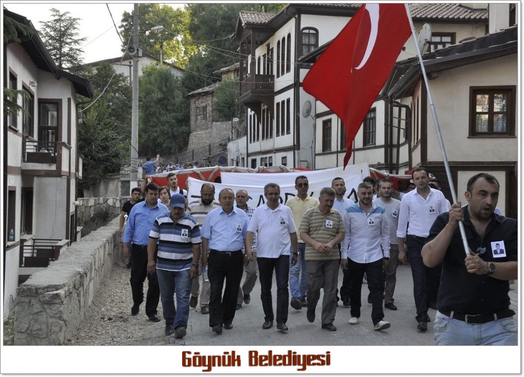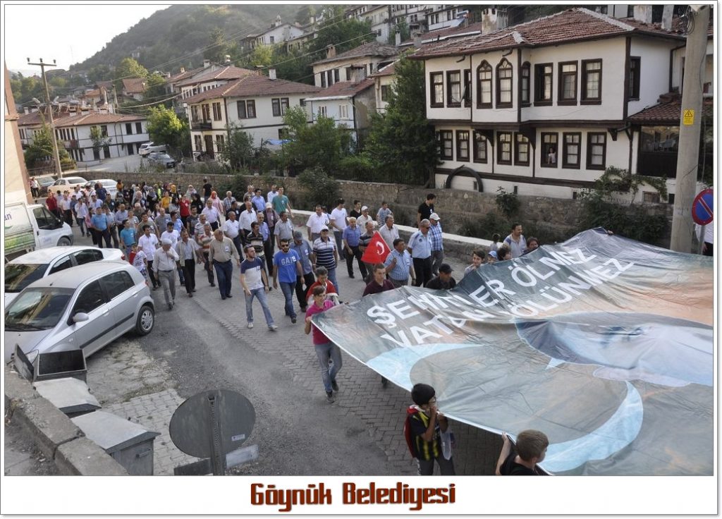 Atatürk anıtı önünden başlayan kortej ilçemiz şehitleri Ziya Sarpkaya, Erdal Engin ve Mehmet Diri’nin isimlerinin yazılı olduğu pankart, fotoğraf ve Türk bayrakları ile Şehidimiz Ziya Sarpkaya’nın kabrinin bulunduğu Sofuali kabristanlığına kadar yürüdü. Burada okunan duaların ardından sona eren anma programı sonrasında; Başkanımız Kemal Kazan Şehidimiz Ziya Sarpkaya’nın Babası Salim Sarpkaya ’ya bir kez daha baş sağlığında bulunurken ‘Devletimiz her zaman Şehit ailelerinin ve Gazilerimizin yanında olmuştur olmaya da devam edecektir. Biz de Devletimizin Göynük İlçesi temsilcileri olarak her fırsatta yanınızdayız. Türkiye Cumhuriyeti Devleti’nin birlik ve beraberliğine, Vatanımızın ve Milletimizin bölünmez bütünlüğüne karşı hain emeller içine bulunanlar asla ve asla cezasız kalmayacaktır. Bu vesileyle vatanı uğruna canlarını hiçe sayan şehitlerimiz Ziya Sarpkaya, Erdal Engin, Mehmet Diri başta olmak üzere tüm Şehitlerimizi rahmet ve minnetle anıyorum” dedi.